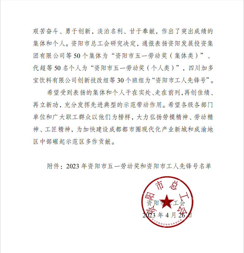 4月26日,资阳市总工会发布《关于2023年表扬资阳市五一劳动奖和资阳市工人先锋号的通报》(资工〔2023〕31号),资阳气电荣获资阳市五一劳动奖(集体类)。